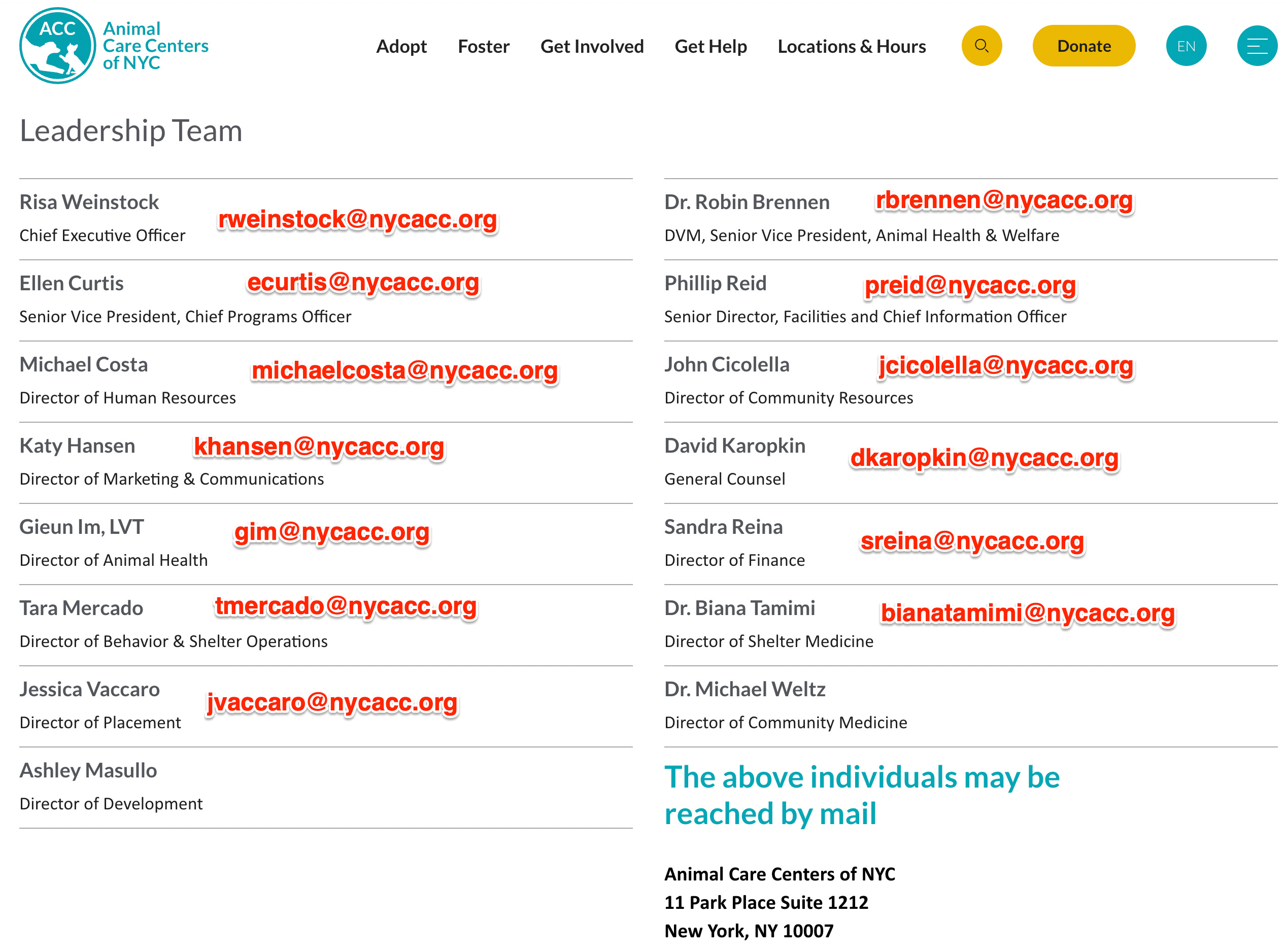 Though ACC is supported by taxpayers, the city conceals ACC personnel contact information from New Yorkers. As a public service, The Scoop New York makes ACC staff email addresses available to readers.