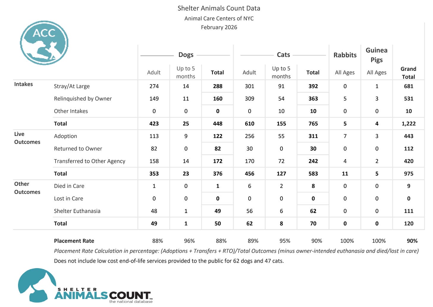 Note that ACC omits from its “euthanasia” totals owner-surrendered animals who were exterminated without being offered for adoption. Placement rates reported by ACC do not include such cats and dogs, but they are counted among the dead by TSNY.