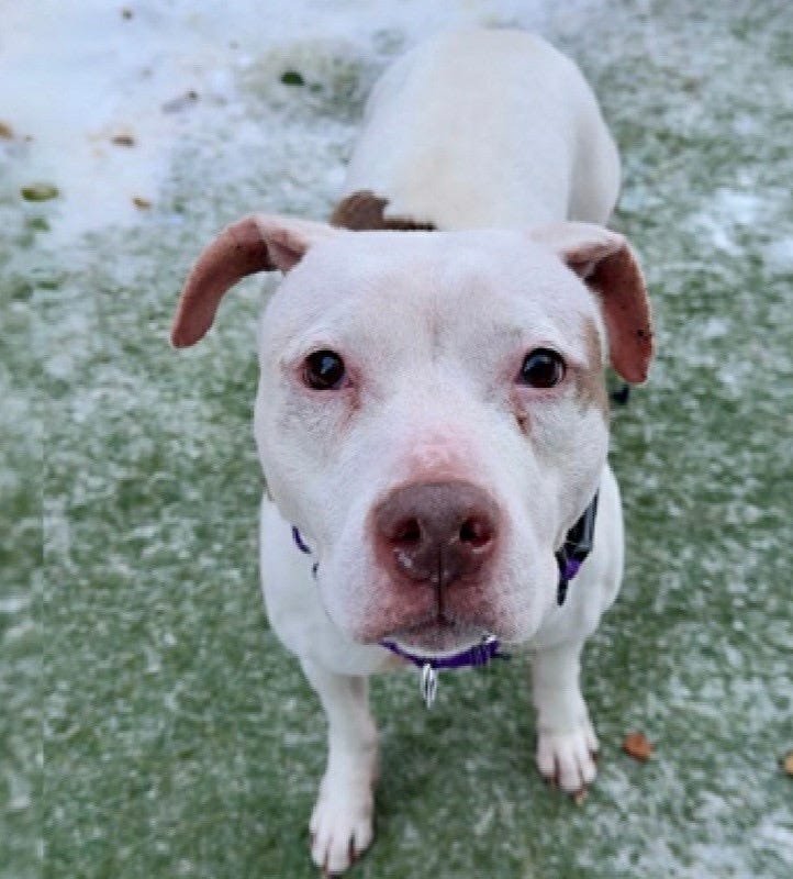 “From the moment I met Chance,” a volunteer said, “I was happy that I had. I found him lying in his kennel, cone flattened to the ground. He lit up when he knew it was his turn to go out, wagging his big cone head to the front of his kennel to be leashed. The cone made him extra silly, unaware of exactly where his body was. We were able to take it off for a bit and give him a break. And then we could really see that absolutely gorgeous big white head and his inky tear drop shaped eyes. Chance loves a toy, specifically he loves to carry one. He gets a big red one from us and spends the next 10 minutes in full bodied wiggles walking between [us] to show it off. He places it right in my palm to play and is oh so gentle about it! He even carries it all by himself all the way back to his kennel.”